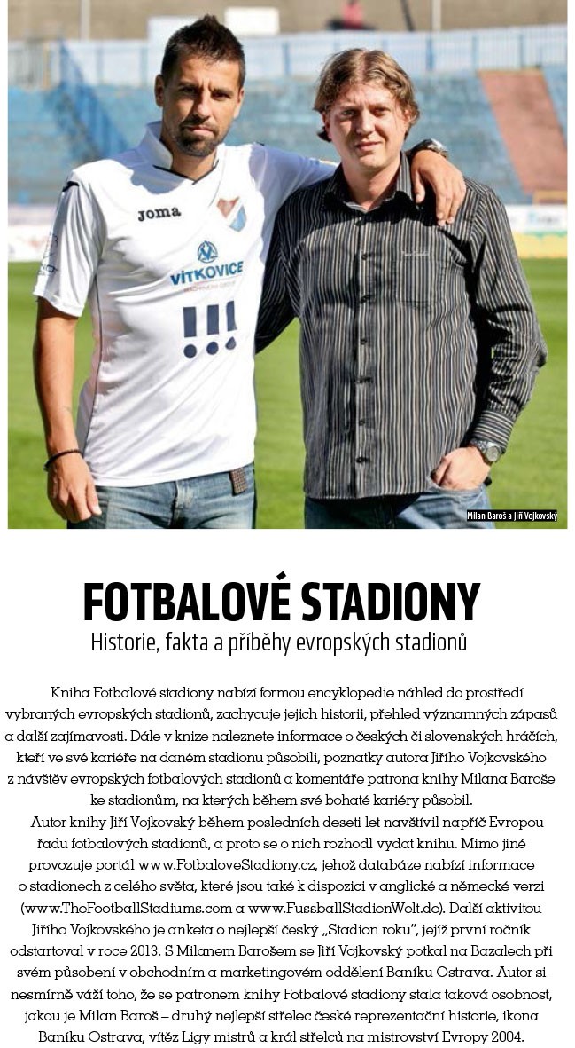 Poznáváte rádi nové stadiony? Nebo navštěvujete jen ten "svůj"? V obou případech je pro vás určena kniha od vytrvalého návštěvníka fotbalových stadionů Jiřího Vojkovského s komentáři od patrona knihy Milana Baroše!