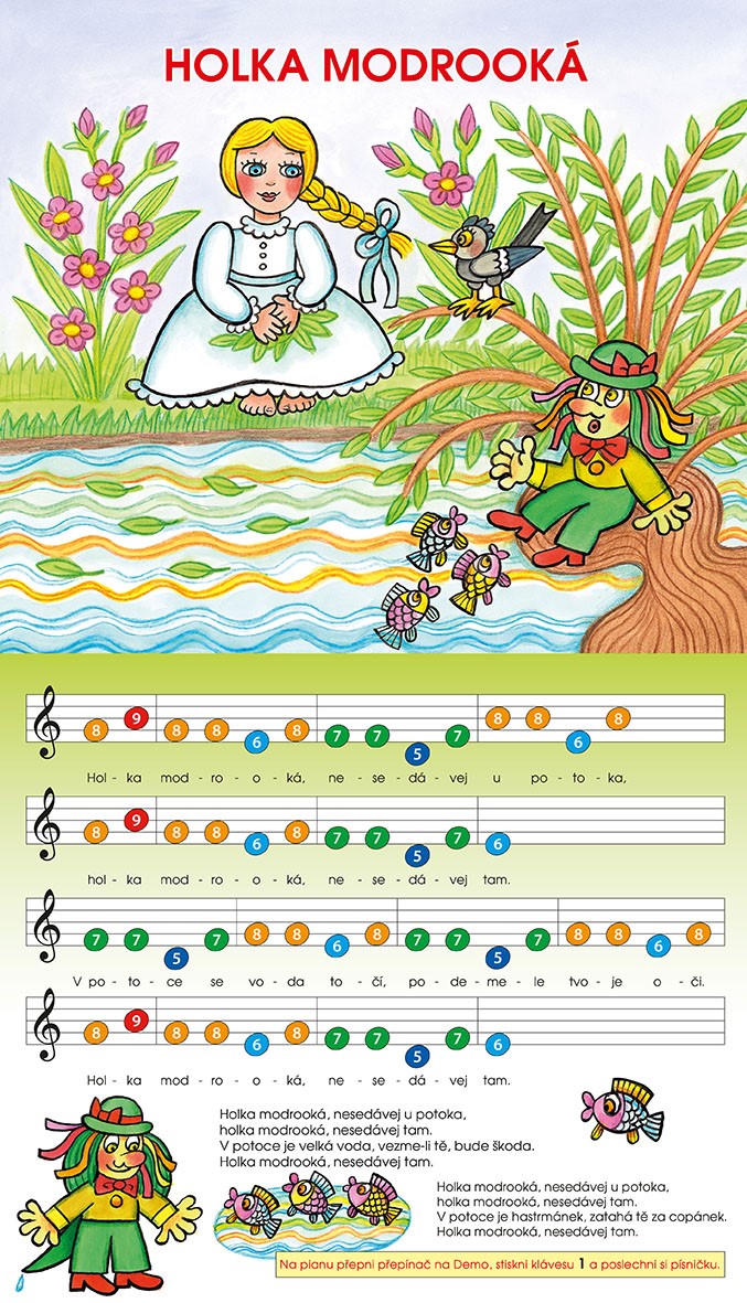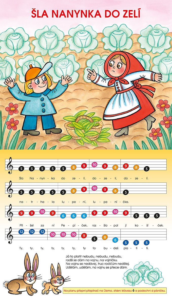 V této knížce najdete dvanáct známých lidových písniček s notami a piankem, na kterém si je můžete zahrát. Noty i klávesy na pianku jsou označené čísly a rozlišené barevně, aby se v nich začínající hudebníci snadno orientovali. Pianko má i funkci, která umožňuje přehrát celou písničku v Demo verzi.