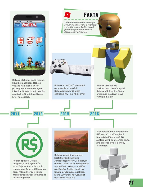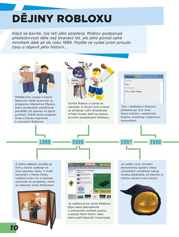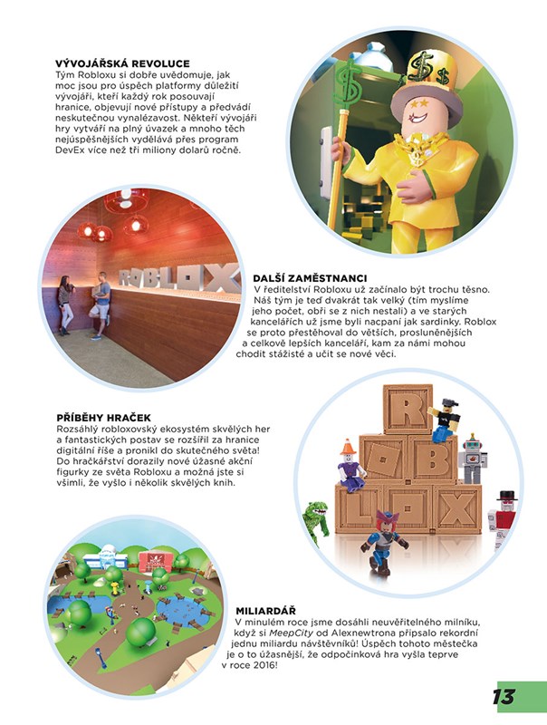 Prozkoumejte nejoblíbenější zážitky, setkejte se s talentovanými členy komunity, prohlédněte si ty nejlepší položky z Katalogu a nechte se pozvat na exkluzivní prohlídku sídla společnosti Roblox. Tato knížka obsahuje spoustu důležitých informací od týmu Roblox a také tipů a triků od nejúspěšnějších vývojářů, kteří jsou součástí nejpopulárnější herní platformy.
