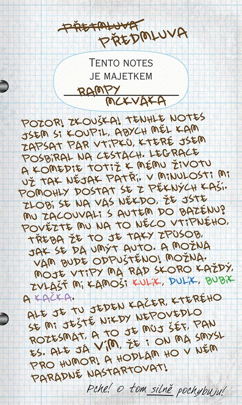 Tenhle notes jsem si koupil, abych měl kam zapsat pár vtípků, které jsem posbíral na cestách. Tušíte správně! Já nejsem jen nadaný pilot, ale taky komik!