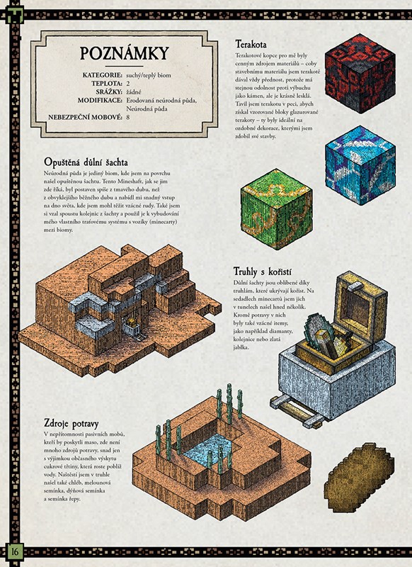 Prozkoumejte tajemný svět Minecraftu prostřednictvím překrásných, ručně kreslených map každého biomu. V rukou máte životní dílo průzkumníka, který se vydává na velkolepou cestu za nalezením nejcennější kořisti Minecraftu. S plánem biomu v Klasickém světě či děsivých dimenzí v Netheru a Endu zmapujete složení každého biomu a objevíte cenné poklady.