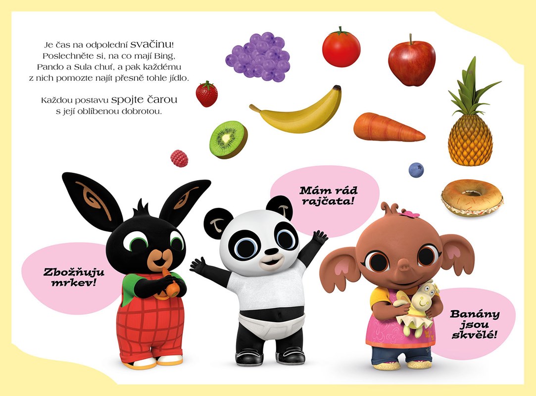 Chutné jídlo se teprve připravuje a někdo je u stolu celý netrpělivý? Bing a jeho kamarádi jsou pro dítě, které se těší na snídani, oběd nebo večeři, ideální společnost. Nedočkavý jedlík se zabaví jednoduchými, ale zároveň nápaditými úkoly, a jednotlivé stránky z odolného papíru lze snadno vytrhnout a použít jako prostírání. Je to prostě recept na skvělou zábavu!